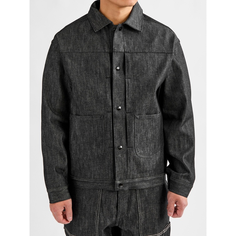 • Presenting a unique blend of American workwear and contemporary gardening, Sassafras’s Gardeners Jacket comes cut in a relaxed fit, pleated jacket design, fitted with an array of pockets. The jacket is sewn using a slub textured 13oz Japanese denim fabric in a modified Type-2 silhouette. Highly detailed, the jacket is fitted with custom metal snap buttons, patch pocket at the waist, selvedge detailing, double needle construction, and bartack reinforcement throughout.