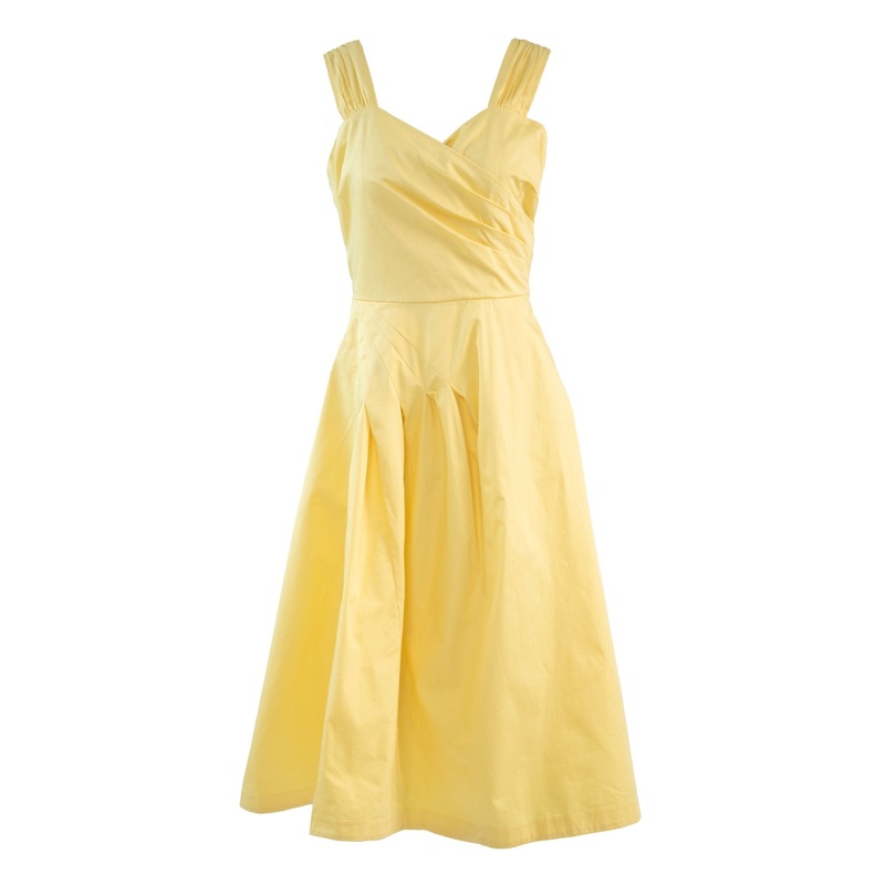 1950s Soul Dress (No. J5736). Vintage-stylefit-and-flare in sultry stretch cotton sateen. On seam pockets. Mid-calf length. Netting under skirt for fullness. Sweetheart neckline and gathered straps. Faux-wrap bodice with pleating. Fully lined. Imported.