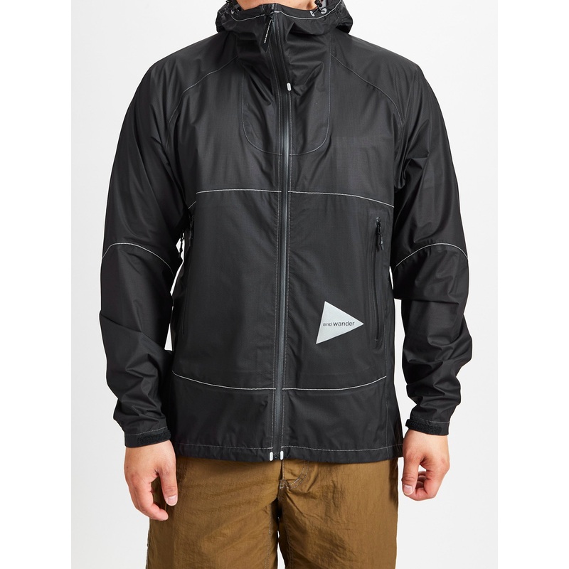 • The3L Ultra Light Rain Jacket from and Wander is built from an ultra-lightweight Pertex Shield fabric which is waterproof up to 20000mgPa while remaining breathable. The jacketcombines this innovative fabric with taped zippers and vents to create a versatile, packableouter shell. The jacket makes use of and Wander’s signature reflective decals and stitching, along with taped and hidden zippers for functionality both in the city and in the mountains.