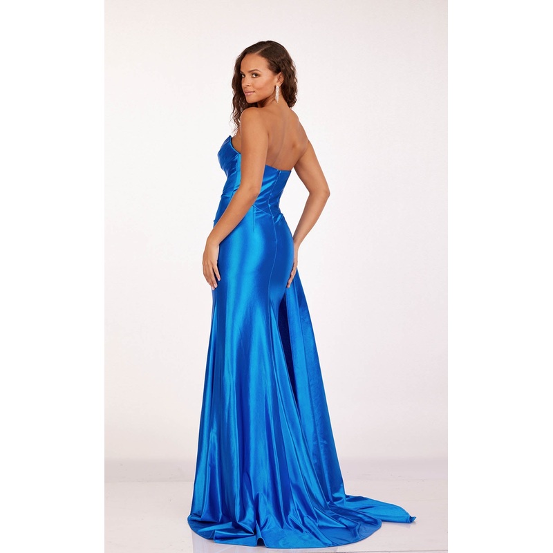 Be the epitome of elegance in this stunning 90215 Abby Paris satin dress featuring a sweetheart neckline that enhances your natural beauty, whereas the luxurious satin fabric adds a touch of sophistication. The side sweeping sash train gracefully drapes, and the high slit creates a dramatic effect. Perfect for formal occasions and evening soires, this dress guarantees a show-stopping look.