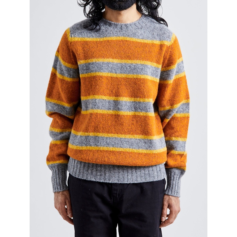 • Howlin’s “Absolute Belter” sweater is crafted in Scotland using virgin merino wool that has been brushed to achieve a softer, hairier texture. The sweater is jacquard-knitted and hand-finished in Scotland, utilizing locally sourced wool and adorned with bold contrasting stripes. This classic crewneck sweater is thoughtfully tailored with raglan sleeves and features thick ribbed detailing for a timeless and comfortable look.