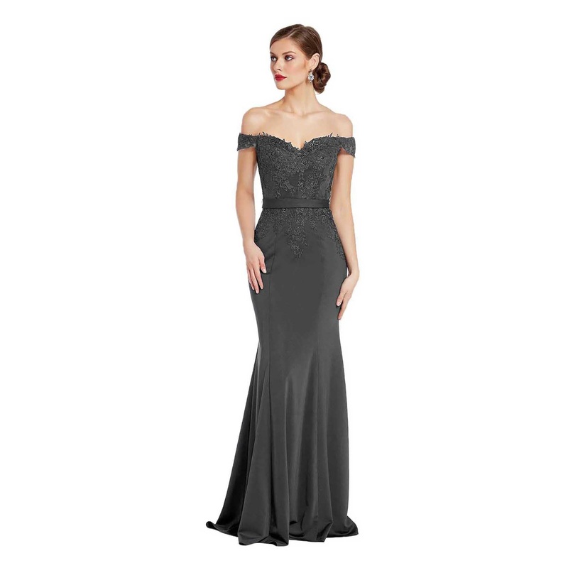 Off-shoulder sheath gown with sweetheart neckline by Alyce ParisRedefine perfect with this charismatic sheath gown designed by Alyce Paris. Its off-shoulder lace embroidered bodice with sweetheart neckline has capped sleeves and flow into a straight across slightly open back. The gown traces your natural curves from the waist and flares slightly from the knees to fall into a sweeping train.