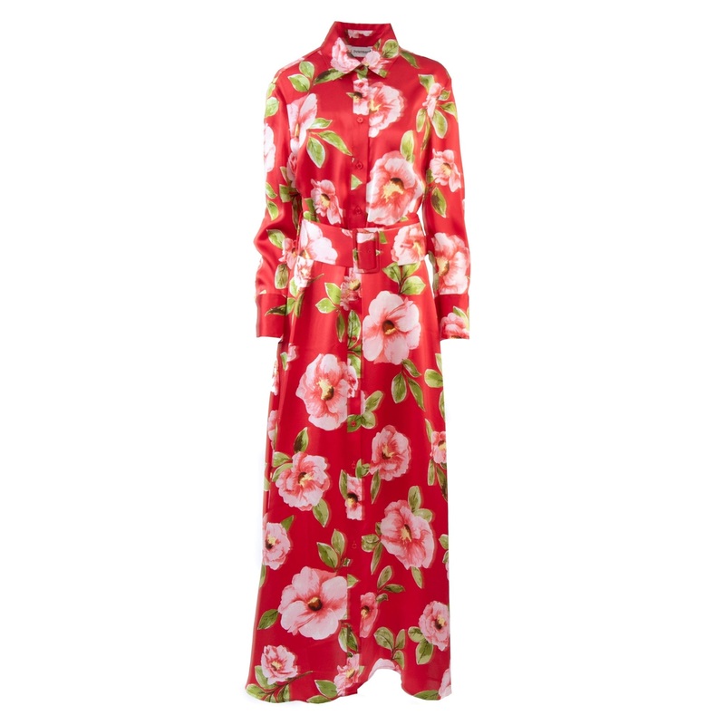 Beguiling Silk Gown (No. J8136). Dreamy silk charmeuse shirtdress gown with buttons at center front from neck to hem. Two buttons at each cuff. Self-fabric belt and buckle. Bust darts. Noteworthy double cuff height. Single pleat at each cuff. Maxi length. Imported.