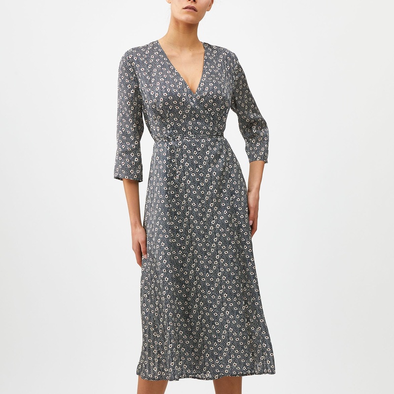 Bella Figura Dress (No. 6487). Luscious silk wrap dress with vintage, hand-painted floral print sourced from the Ratti vault in Como, Italy. Self-fabric belt. Three-quarter sleeves. Lined skirt. Print is White and Red over Navy. Imported.