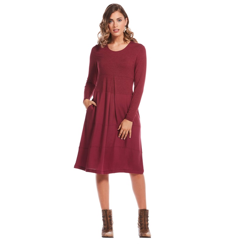Borderlands Dress (No. 5784). Pullover, fit-and-flare style that elongates your figure. Some credit goes to the inverted box pleat below the waist and some to the magical properties of this heathered jersey knit cotton blend, for a bit of stretch and shape through the bodice, waistband, and sleeves. Scoop neckline, empire waist seam. Skirt is a drapey rayon twill with horizontal seaming detail. Below-knee length. Side pockets.Imported.