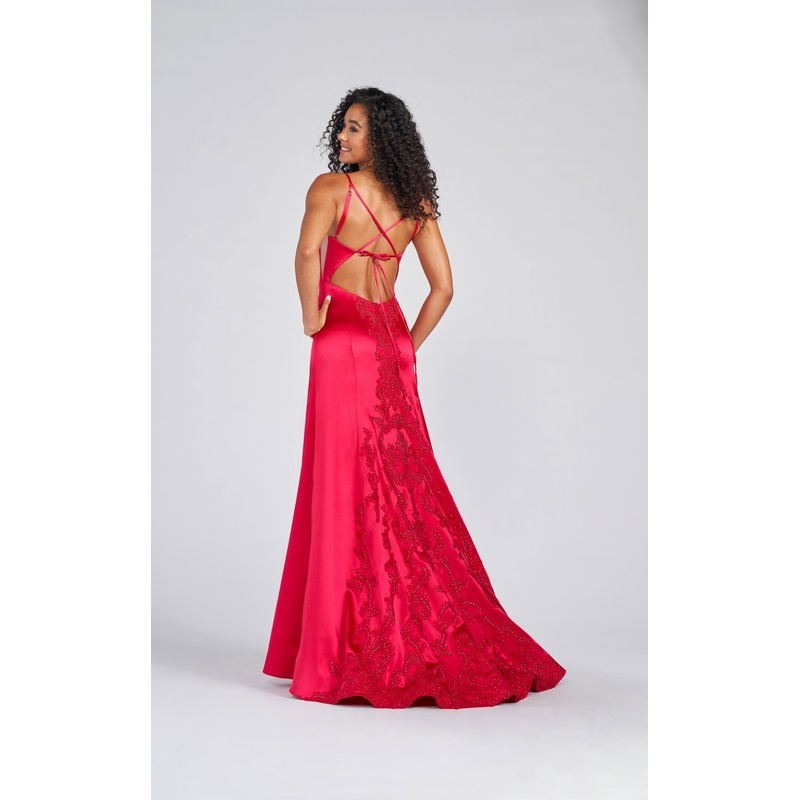 Strike a glamorous pose in this exquisite Colette 12274 dress. It has a sleeveless design with a scoop neckline and an open back with lace-up accents. The satin dress has a solid finish at the front and floral lacework at the back. Its trumpet skirt ends with an effortless sweep train. Pair it with glass sandals for the perfect ensemble.