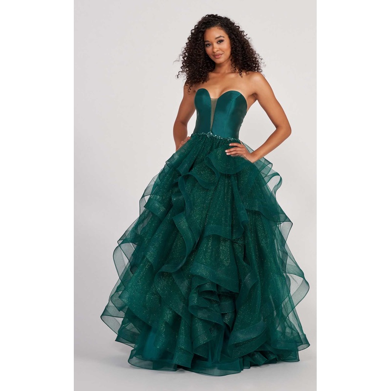 Be the gleaming diva as you slip on this beautiful ball gown by Colette 2006. Designed with a strapless plunging neckline, this gorgeous gown has a fitted bodice of luxurious fabric. The skirt has ruffled detailing made with gleaming fabric and a thigh-high slit to add an amp to the outfit. The dress is sure to provide you with a cinched waistline with its fitted bodice adorned with rhinestone detailing.