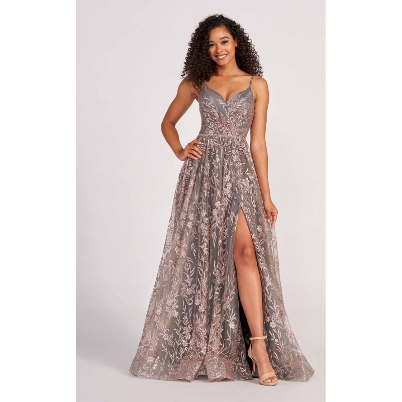 Be the style icon as you opt to wear this gorgeous A-line high-slit dress by Colette 2022. Made with novelty glitter tulle, the dress has been designed with a sweetheart neckline with spaghetti straps and a fitted bodice. It has an open lace-up back which looks absolutely stunning. Accentuate your look for the next event with this gorgeous dress.