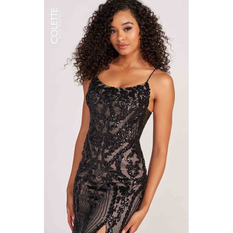 Make people stare when you walk in this stunning dress designed by Colette 2035. It comes with a scoop neckline. The sleeveless design is enhanced with the presence of fully beaded shoulder straps. It has a fitted bodice and a strappy design on the back. The natural waistline follows a thigh-high slit. This full-length dress is embellished with a sequin pattern throughout.