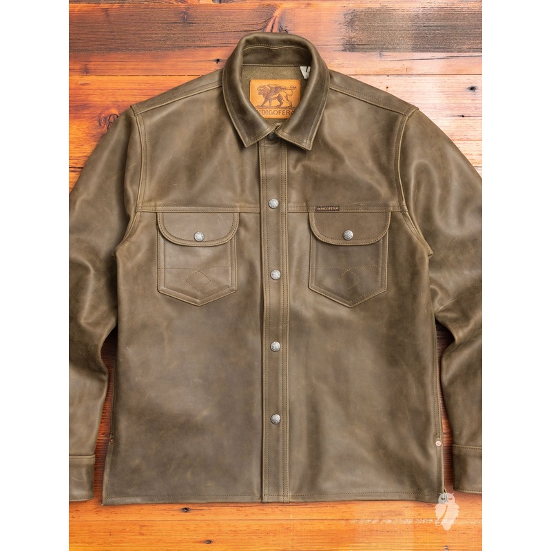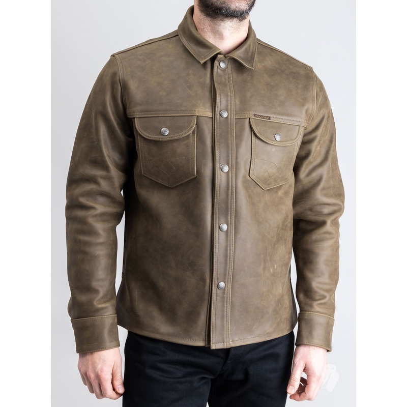 • The Copeland is a rugged no-nonsense overshirt from Indigofera of Sweden. This luxe installment is crafted using a heavyweight nubuck cowhide leather that sports an incredible amount of grain texture. With wear and exposure to sunlight, the leather will darken to create a jacket unique to each owner. Equipped with two chest pockets and a custom branded brass snap button placket.