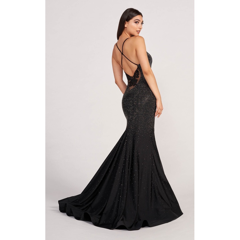 Stun people around you when you pull off this shimmery dress designed by Ellie Wilde EW34005. It comes with a plunging illusion V-neckline. The sleeveless design is enhanced with the presence of skinny shoulder straps. It has a fitted bodice with a butterfly back detail. The natural waistline follows a full-length skirt with a thigh-high slit. This dress has stone embellishments throughout and ends with a sweep train.