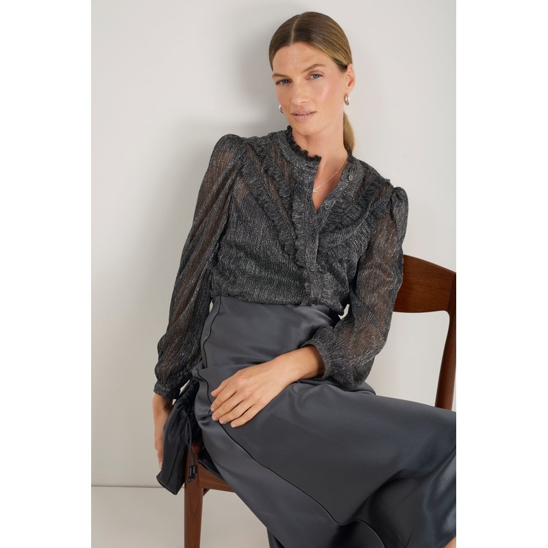 The Fern blouse is proof that shimmer can be effortless. Cut in a soft pewter metallic jersey, it brings a subtle glow that instantly lifts your Wyse capsule pieces without feeling overt. A delicate frill traces the placket and continues diagonally towards the shoulder, adding a considered feminine detail that catches the light with movement. Supplied with a removable cami, it offers ease and versatility wear it sheer for evening or layered for daytime polish.