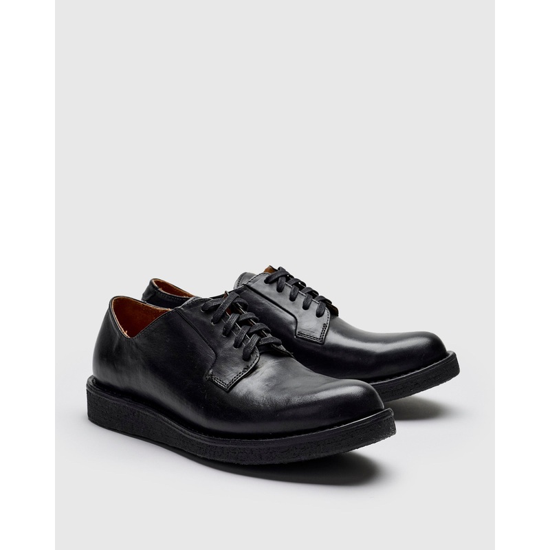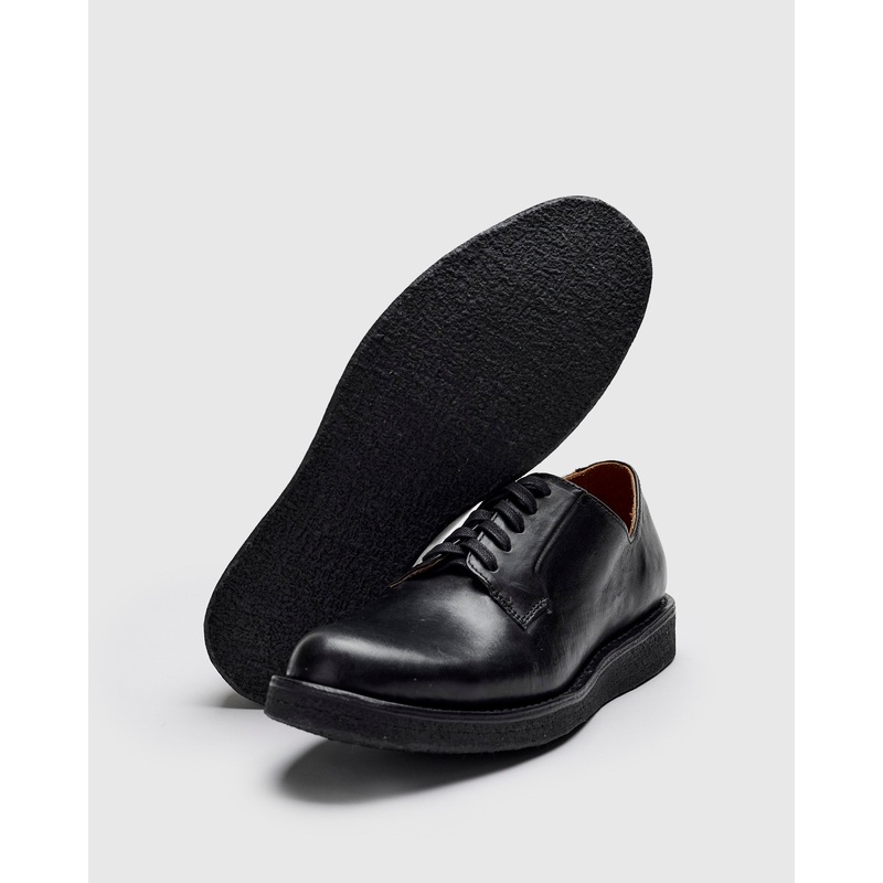• visvim presents their minimalist interpretation of the classic derby silhouette. The G.P.O Folk features a streamlined upper built around a single panel for a clean and seamless appearance. This iteration is made with a full grain vegetable-tanned horsehide and stacked black crepe sole. Constructed with a natural leather liner and encapsulating 360 degree welt, each shoe comes handmade from master craftsmen.