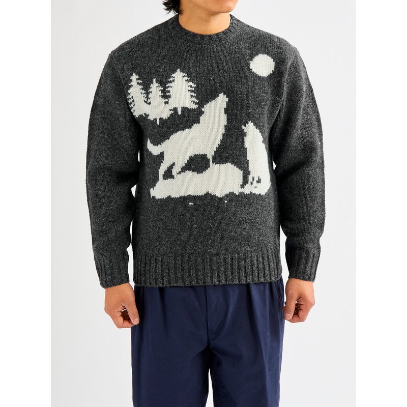 • Made with thick 3-gauge wool yarn, this crewneck sweater employs an Intarsia block knitting technique to achieve its decorative patterns. Utilizing thick shetland wool yarn, known for a rough-rustic appearance and heat retaining properties. Cut in a regular fit with ribbing at the hem and sleeves.