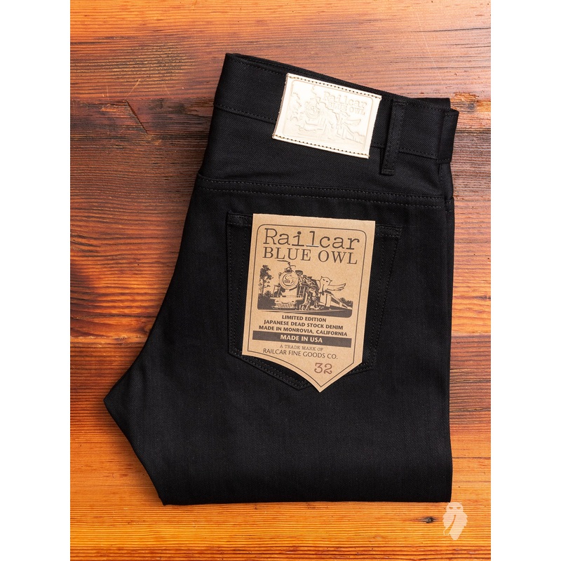 • Made exclusively for Blue Owl, these jeans from Railcar Fine Goods of California are crafted using deadstock Japanese selvedge denim from Itochu Mills of Japan. The 11.5oz denim sports a uniform texture reminiscent of jeans from the early 1900s, and features a sleek black color that will fade to an ash grey with wear. Fitted with signature Railcar details such as tucked waistband chain stitching to prevent unraveling, two-piece waistband, shell edge interior fly pieces, and a custom branded leather patch.