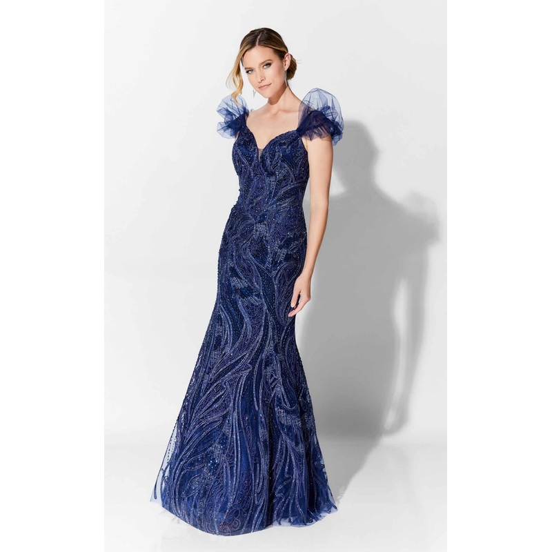 Radiate royalty vibes in this Tulle Layered Puff Sleeves Embroidered Sheath Silhouette by Ivonne D 122D64. This gorgeous silhouette has a fitted bodice with an illusion semi sweetheart neckline and a pair of tulle layered short puff sleeves. The sheath skirt flows gracefully till the full length. The silhouette is embossed with embroidery, bead, and jewel work all over its surface.