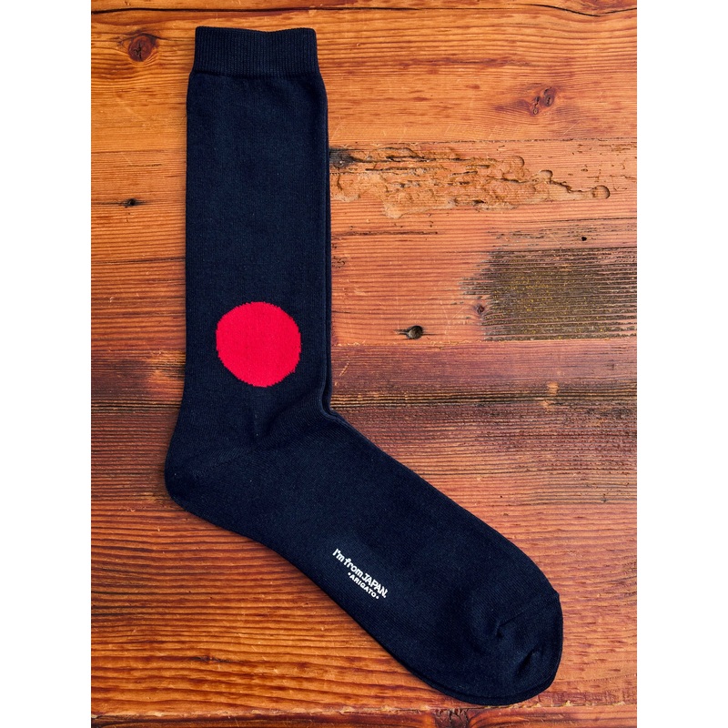 • These full-length socks from Blue Blue Japan are woven using a soft and flexible cotton-blend fabric, and feature a simple crimson-red circle design at the ankle as an homage to the “Hinomaru” flag of Japan. Cut and sewn in Tokyo, Japan.