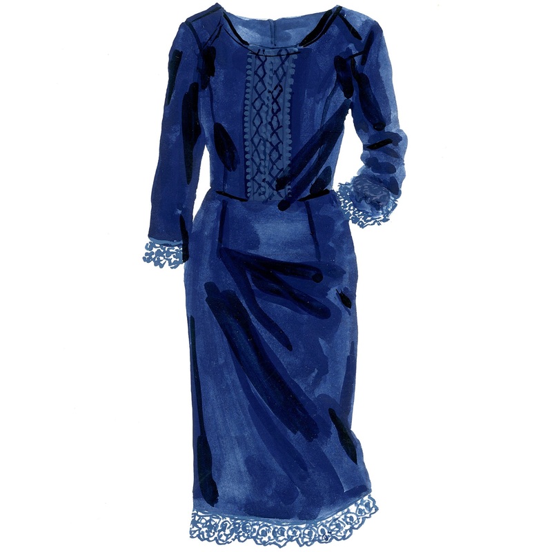 Cotton satin fabric Dyed-to-match lace detailing at center front placket, sleeve edges, and hemline Front princess seams Scoop neckline Below-knee length Stretch lining for shaping Three-quarter-length sleeves Center back vent