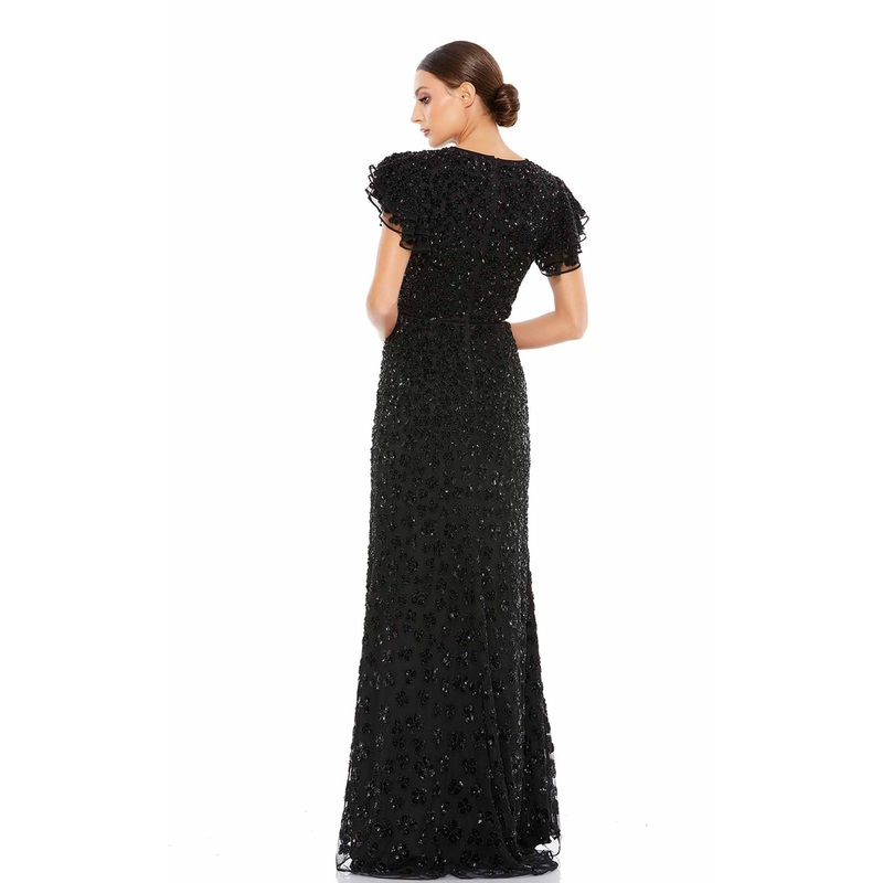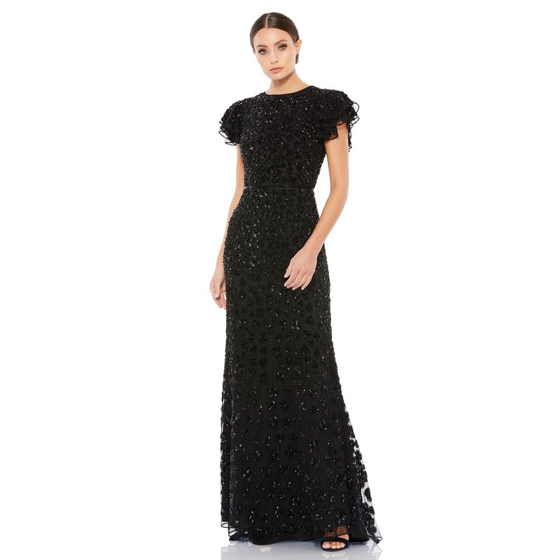 Look absolutely delightful in Mac Duggal 10748D Dress. This sublime piece features a column silhouette and glittering accents. The short sleeve bodice has a high neckline neckline and a natural waist.