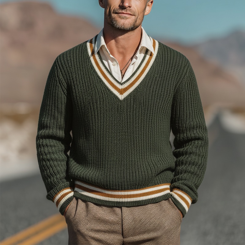 Men’s Autumn Fashion Cotton Knitted Contrast Color V-Neck Sweater MTA1736I9P Army Green