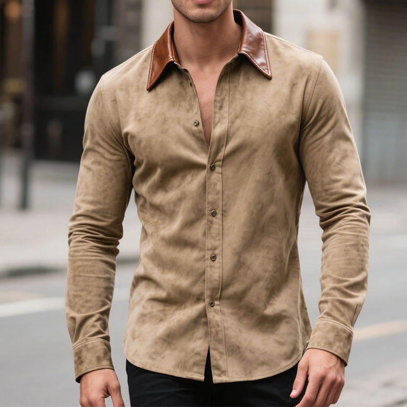 The Men’s Retro Casual Leather and Suede Lapel Long Sleeve Shirt offers a stylish blend of vintage aesthetics and modern comfort. Crafted for the sophisticated individual, this piece stands out with its dual-material design, combining leather and suede elements for a unique textural contrast.