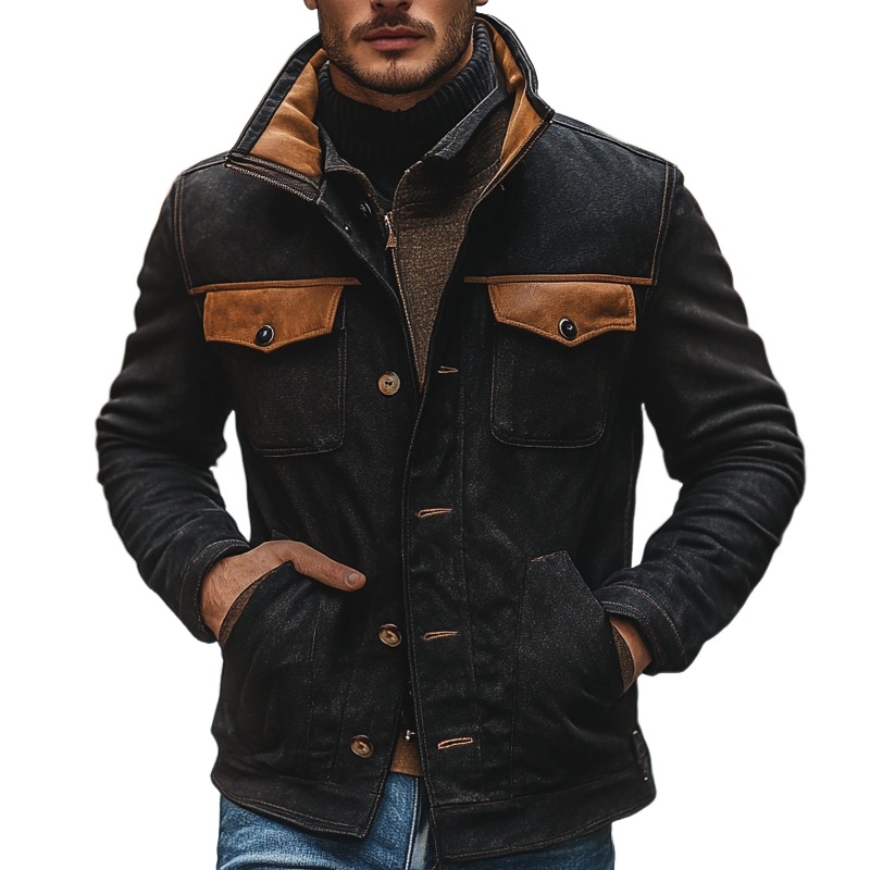 Product NameMen’s Retro Stitching PU Lapel Single-Breasted Contrast Color JacketDescription