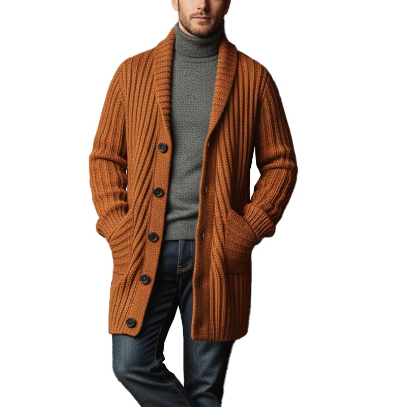 The Men’s Winter Fashion Shawl Collar Ribbed Cotton Yarn Knitted Mid-length Cardigan is a harmonious blend of elegance and practicality, perfect for the cold winter months. Its shawl collar and ribbed design bring a touch of sophistication while ensuring warmth and comfort.