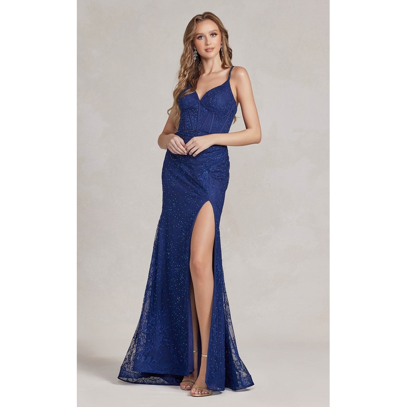 This alluring evening gown by Nox Anabel B1145 will make you a star. The fitted bodice has a V neckline and sheer inset detail at the bust. The ensemble features stunning glitter embellishments. The skirt features a full-length sheath silhouette, and high-slit. The spaghetti straps support the top and lead to the corsets open back. This glamorous gown will make an unforgettable evening.