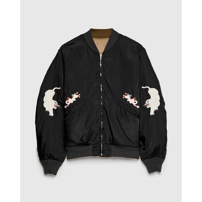 • Inspired by military flight jackets this reversible MA-1 features souvenir style embroidery on the interior face. Crafted from a densely woven nylon twill, the jacket features a lightweight loft and smooth finish. The 2-way design is cut in a relaxed fit with a handful of vintage details. The jacket features cotton ribbing at the collar and hem, as well as welt hand pockets at both the interior and exterior.