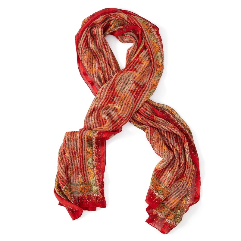 Payal Silk Stole (No. 5930). Pure silk crinkle georgette. 20 ” W x 69″ L. Equally unforgettable as a stole or wrapped around like a scarf. Red, fiery orange, and olive placed jacquard print. Keeps you out of the shadows. Made in India.