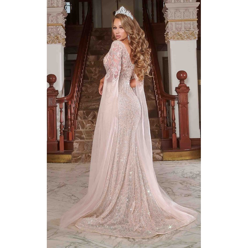 Walk with pride and confidence in this bold dress by Portia and Scarlett PS22907. The figure flattering dress shows glitter accents and sequins from the waist while the torso is adorned with mesh embroidery details. Featuring a V-neckline, sleeves with a cape attached to it and a sheer back. The fit and flare silhouette features a horsehair hem and a sweeping train.