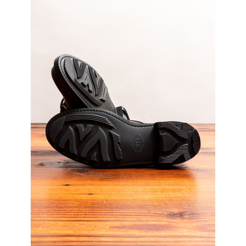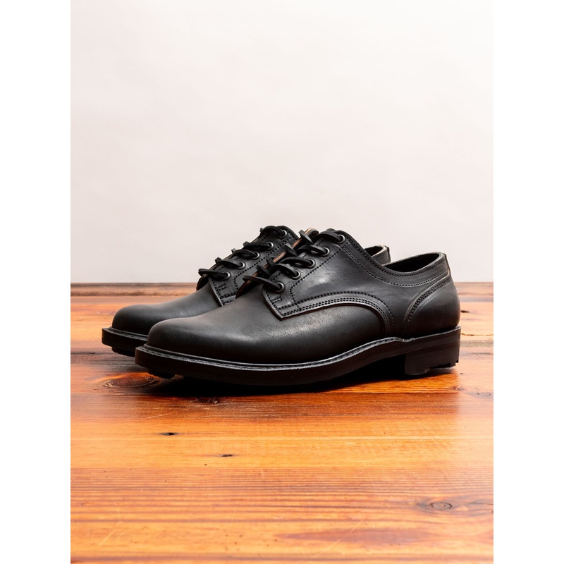 • The Ridgeway Derby is a sleek low-profile footwear style from Truman Boot Co. of Oregon. Built exclusively for Blue Owl, the shoes are crafted using matte black horse rump leather from a famed Italian leather tannery with over 120 years of history. The shoes are anchored by ridgeway soles from Dainite of England, which provide enhanced traction in wet climates, with further weatherproofing in the form of a 270 degree storm welt. Fused together using traditional Goodyear welt construction, and detailed with Truman’s sleek field heel design, and black stitching and hardware throughout.