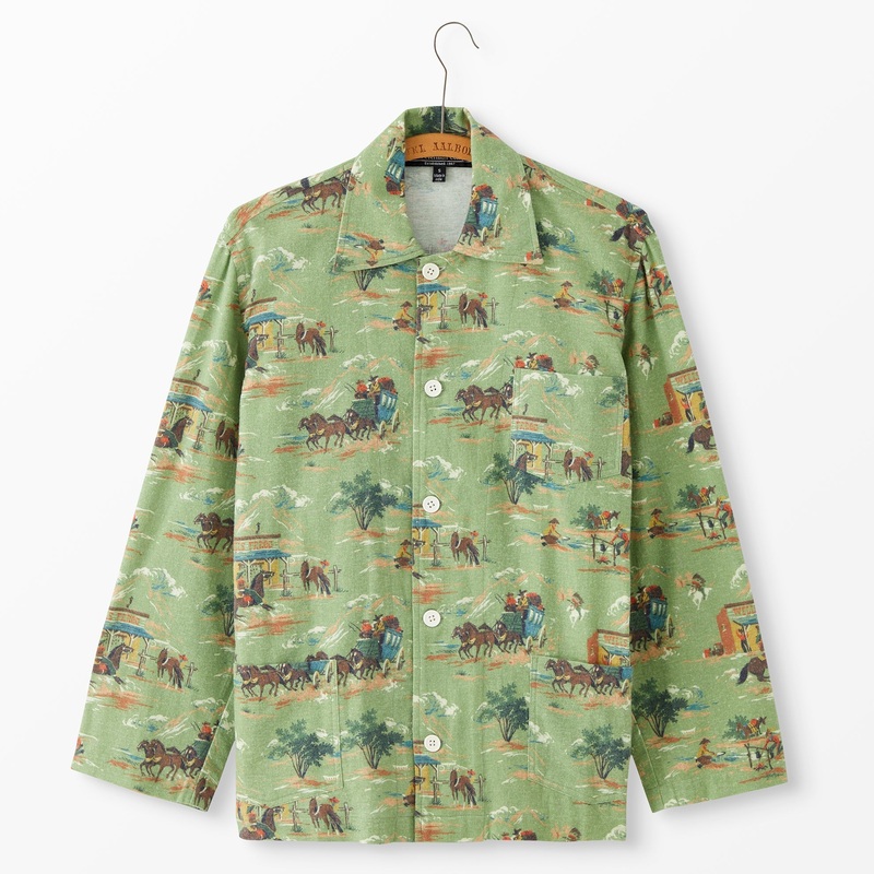 Rodeo Flannel PJ Shirt (No. J7872 Mint).Classic, exceptionally comfortable cotton flannel pajamas in a mid-century artful western print. Shirt has contrast piping at collar, cuffs, pocket facing and center front edge. Chest pocket and two pockets at front hip.