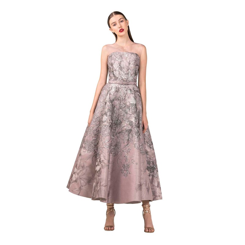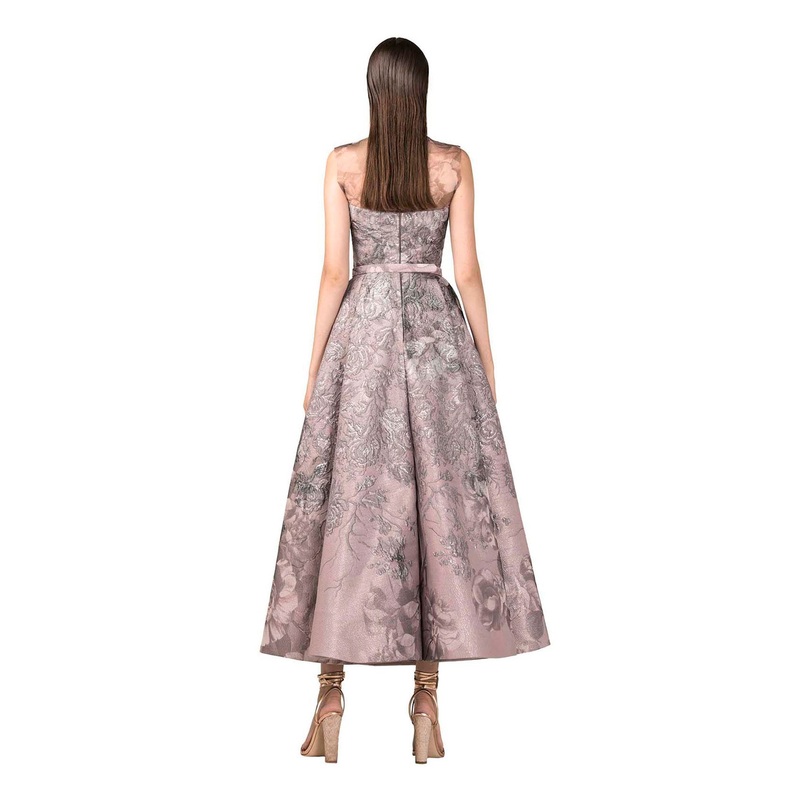Tea-length A-line gown with illusion jewel neckline from Saiid KobeisyEmanate a cheerful vibe with this metallic floral print ballgown from Saiid Kobeisy. Its sleeveless fitted straight-lined bodice has an alluring illusion jewel neckline that leads to a zipper closure back. The A-line skirt flows down to the tea-length in a ballgown silhouette from the thin waistband to complete the look.
