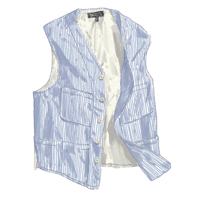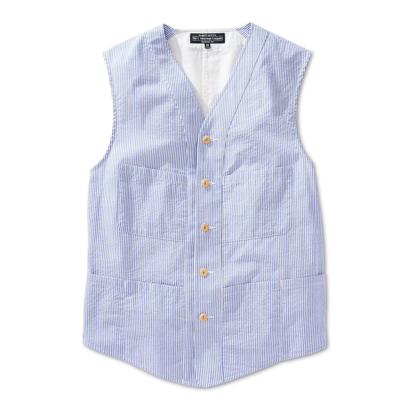 Seersucker Vest (No. 6974). 100% cotton seersucker. Lined in Bemberg twill. Straw 2-hole button. Antique nickel buckle. Imported.