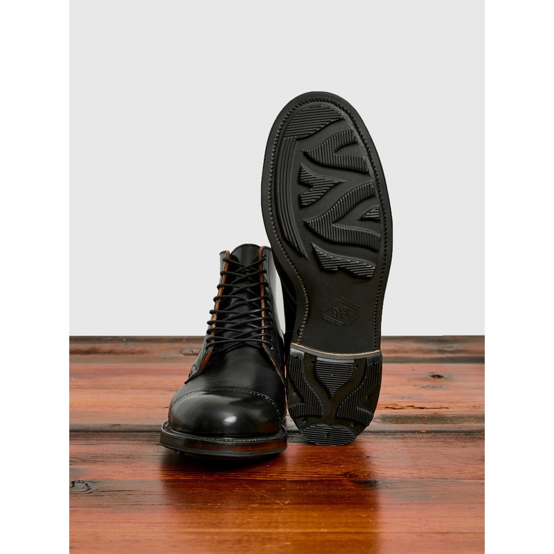 This iteration features Maryam Tannery’s Vachetta Lucida Horsebutt leather, a heavyweight vegetable tanned tea-core leather known for its supple oiled surface and dense structure. Maryam’s Vachetta Lucida tannage is heavily stuffed with oils and waxes, penetrating into the shell portion for a more flexible horsebutt leather with a subtle luster. With wear over time, the black surface will scrape away to reveal the leather’s brown core color. The boots are anchored with a Ridgeway sole fused together with Viberg’s signature stitch-down construction. Finished with tonal stitching, branded leather insole, and metal eyelets.