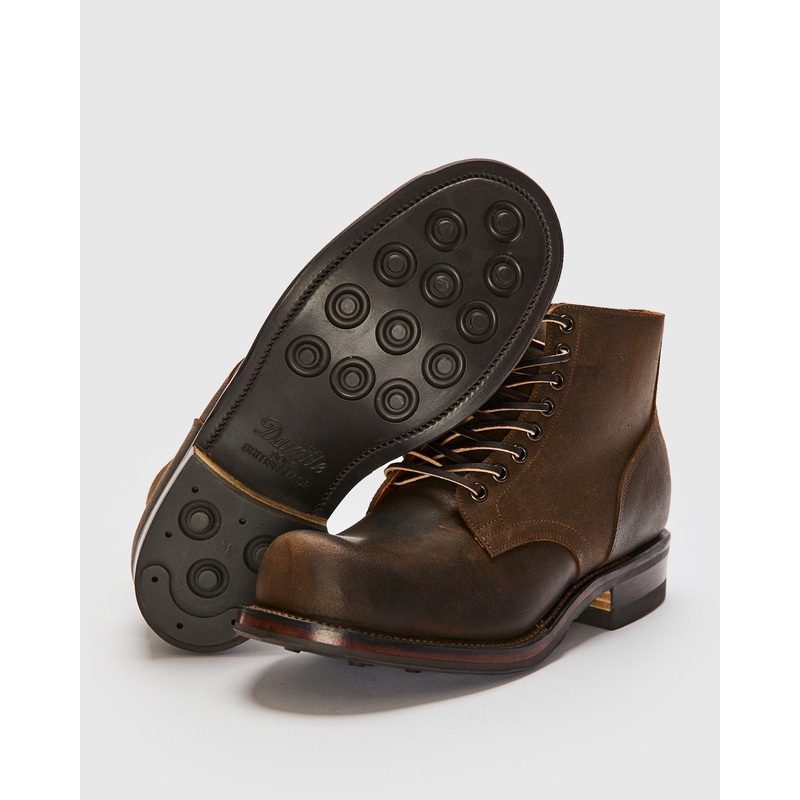This iteration features C.F. Stead’s rugged Waxy Commander tannage. The Commander leather is a heavyweight waxed suede that undergoes a special curing process to shrink and tighten the fiber structure, making it exceptionally tough, durable, and water-resistant. The leather’s waxy finish and high pull-up allow for a slow, rich development. Fitted with English Dainite soles for extra grip and protection in wet weather environments.