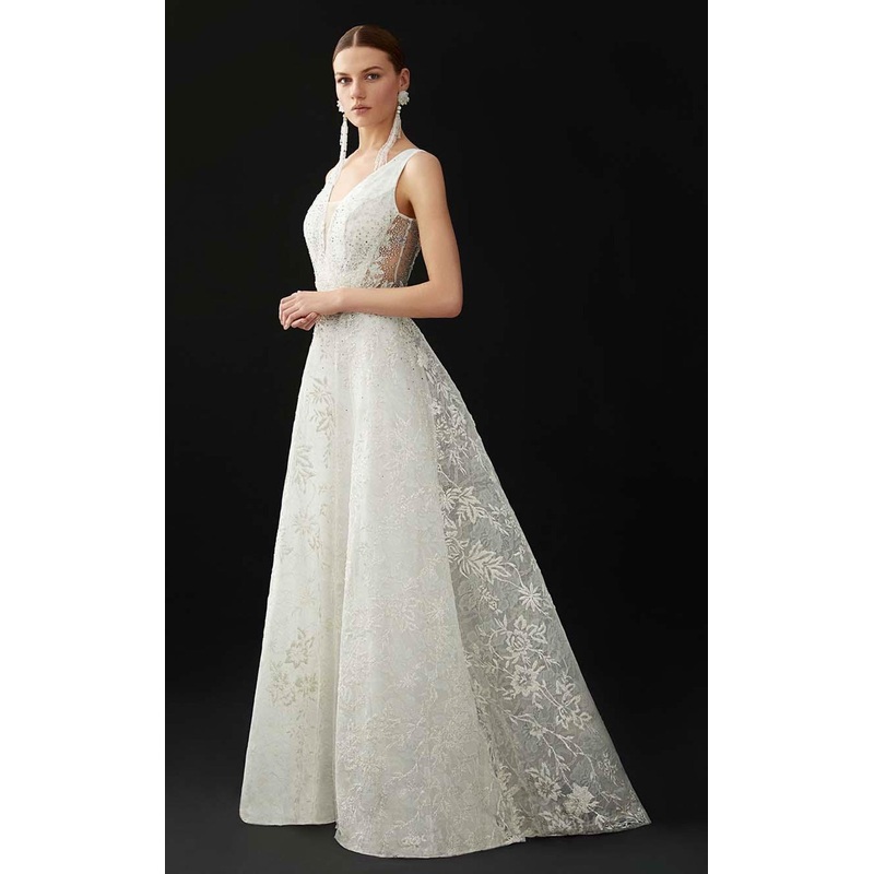 Deep V-neck Floral Embroidery Wedding Gown by Tiara