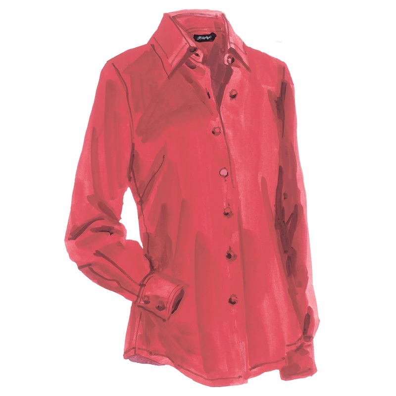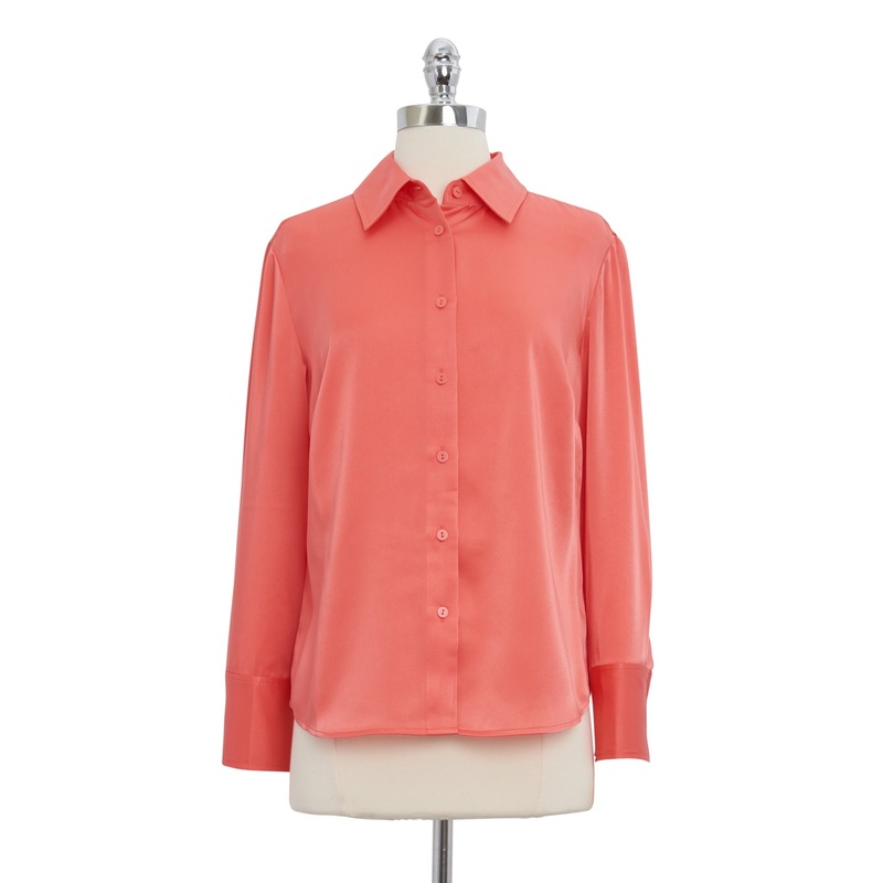 Wild Silk Blouse (No. 6550). A lustrous silk weave that can own a room all by itself. (Well, you know what I mean.) Pointed collar with topstitching. Seven dyed-to-match shell buttons down the center front. Side darts. Four-inch cuffs with two stackable buttons on each. Shirttail hem.